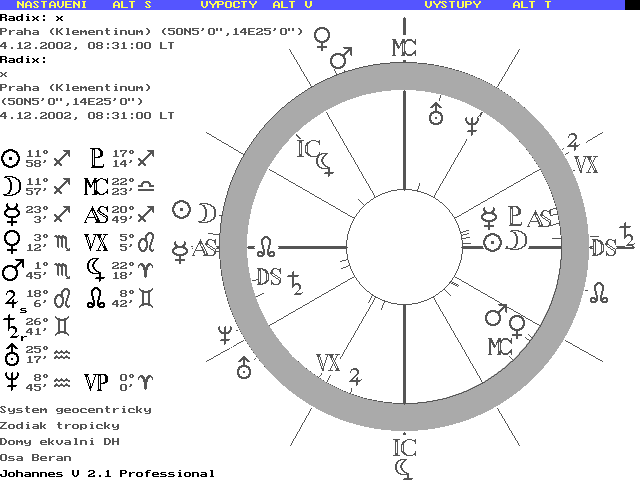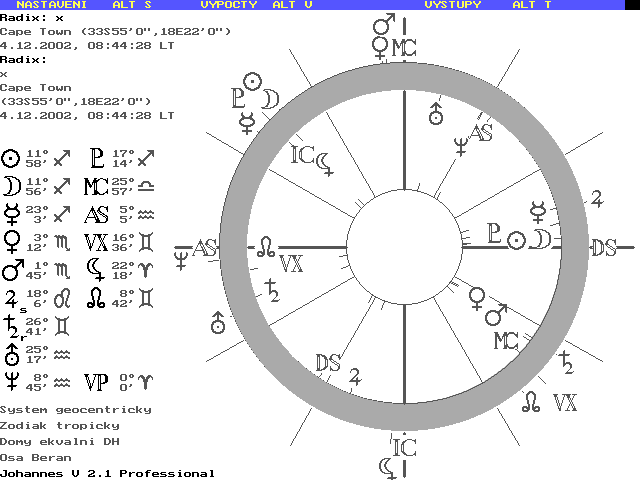 Dobrý den. Tak třeba před šesti lety dnes odstartoval Mars Pathfinder (přistál 4.7.1997). Taky nad Jižní Afrikou a Indickým oceánem bylo dnes ráno viditelné úplné zatmění Slunce. Užila jsem si v Cape Town a představovala si z Prahy (možná obráceně), kde (jako všude jinde) máme právě Nov, položila jsem na sebe horoskopy v Campanových a Ekválních domech, zobrazení anglosaské – domy převedené na 30ti stupňové prostory s původním obsahem prvků. Těžiště horoskopů jsou výrazná a samozřejmě různá, propojená stejnou astronomickou událostí. Možná někoho takové porovnávání taky potěší. To jen tak. LA