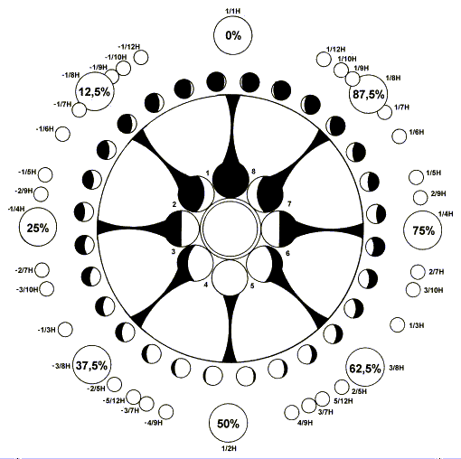 V Johannesovi je v tabulce Vstup a elementy - Zakl - Fáze Luny uvedená v procentech. 0% je Nov, 50% je úplněk. Na přiloženém obrázku je patrno, jak je možné snadno zjistit o kterou fázi jde, ať už se jedná o cyklus osmé a nebo třeba třicáté harmonické.