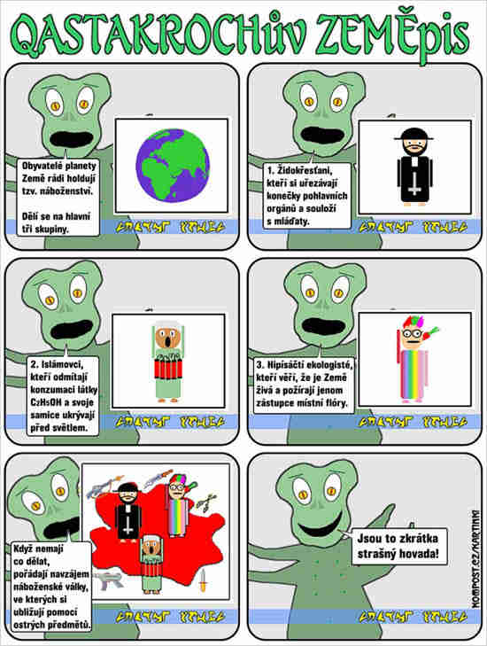 muheheéé:)) mně se nejvic líbí hipísácký ekologista. Hned jsem si vzpomněla na píseň z Jaye a Mlč. Boba: Blíží se ke mně výzkumnííík...já nechci ten sprej v očích mííít...