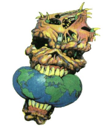 Tam byl ještě jinak - Zemi držel drápatou tlapou, a z tlamy vybavené ostrými tesáky nad ní slinil. Ale hlavně ten nápis pod tím: