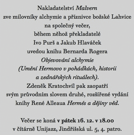 Byl to pěkný podvečer, sešli se staří dobří známí i nové tváře. Ivo Purš měl pěknou přednášku o René Alleau-ovi a Dr. Zdeněk Kratochvíl improvizovanou o úskalích překladů a interpretacích starověkých textů, o Hermovi Trismegistovi a Hermovi Kyllénském v němž rozpoznává princip triku a vtipu, o ironii Platonově, který chtěl všechno mít pod kontrolou, o tom, že na přírodovědecké fakultě ve Viničné se překládají neortodoxní gnostici a jeden tam píše diplomku na téma alchymie. Oživili jsme tam myšlenku spolupráce s naším Sdružením pro rudhyarovská studia a nasmáli se tomu, jak je ošidné vydávat věštby, které se sice někdy naplní, ale v úplném jiném kontextu. Kdo chyběl pochybil.