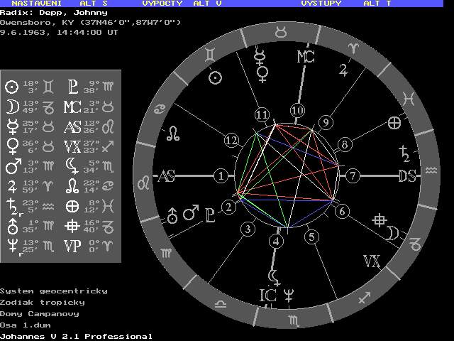 dotaz: jaké planetární funkce a jejich vztahy vidíte v projevu herce Johny Deppa. Jaké průsečíky hrotů domů znameními: něčeho zcela individuálního jako jsou domy něčím kolektivním jako energie znamení - tj. místa možného plného vědomí, vidíte v jeho projevu. Souhlasí to s jeho nativitou?