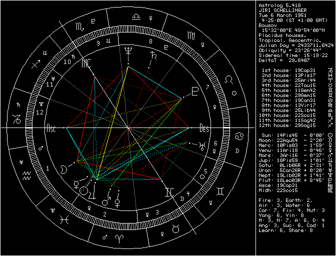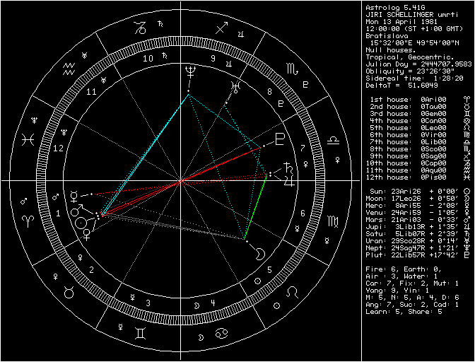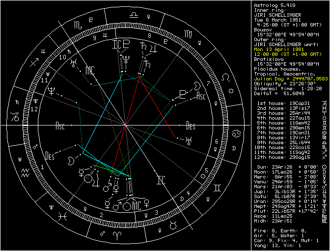 Každý z nás v ten den něco měl. U Jiřího Schelingera je myslím si podstatné, že šlo o období krátce po přechodu Saturna přes jeho radixovou pozici, že se mu tím v podstatě aktivovala radixová T-kvadratura Uran / Saturn / Mars, že radixového Saturna má v 8. domě, že kvadratura tranzitního Saturna k radixovému Uranu byla ten den skoro přesná (orbis pouhých 19 úhlových minut), a že i ten Mars, který byl v konjunkci se Sluncem a v opozici k Plutu, je součástí jeho radixové T-kvadratury. To je příliš mnoho věcí najednou, myslím si. Nechci tvrdit, že bych mu z toho dokázal prorokovat smrt, ale obtížné a velmi rizikové období zcela jistě.