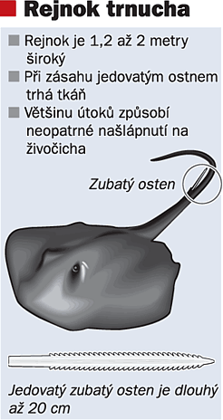 Steve Irwin, známý především z televizních seriálů o přírodě", zemřel v pondělí při natáčení nového dokumentu o podmořském životě. U Velkého bariérového útesu v severovýchodní Austrálii ho bodl do hrudi rejnok. "Vážně zraněný ´lovec krokodýlů´ Steve Irwin si před smrtí vytáhl jedovatý osten v hrudníku. Poté ztratil vědomí a zemřel," přibližuje poslední okamžiky Irwinova života jeho manažer John Stainton.