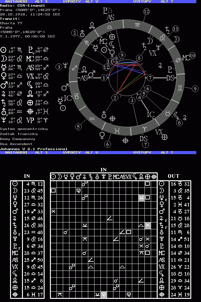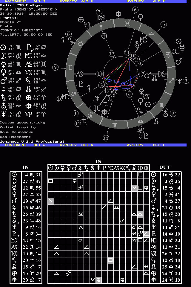 6. ledna 1977 ve večerních hodinách vyšel v pařížském Le Monde text Charty 77. Do Prahy se ta zpráva donesla okamžitě a od 2 hodiny ráno 7. ledna měla StB pohotovost. Následoval dopolední hon na kurýry Charty, kteří byli dopadeni v Gymnasijní ulici v Dejvicích. V tranzitním horoskopu vůči radixu ČR (19 hod) nacházíme pěknou konjunkci Urana s Vertexem republiky, (Později dorazí Uran k Merkurovi)