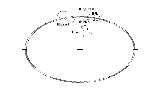 Siderický zodiak ERA*) představuje cyklus dvanácti fází (v dalším textu psaných kapitálkami), reprezentujících zodiakální souhvězdí. První fáze tohoto zodiaku odpovídá nikoli souhvězdí Berana, nýbrž souhvězdí Blíženců. Nazýváme jej podle toho fází BLÍŽENCŮ, po které následují fáze RAKA, LVA atd. Přesný počátek tohoto zodiaku je definován severním průsečíkem ekliptiky s galaktickým rovníkem ( = rovinou naší Galaxie, tj. kružnice proložené středem roviny Mléčné dráhy). Počátek cyklu ERA je v současné epoše precesního cyklu (přesně v období poloviny 90.let) totožný se slunovratovým bodem. Zároveň se téměř přesně kryje s bodem, který leží na pomezí tří astronomicky stanovených hranic výrazných souhvězdí zimní oblohy: Býka, Blíženců a Orionu, za jasných nocí viditelných jako kulminující oblast ekliptiky. Počátek cyklu ERA a dvanáct 30° fází, které reprezentují zodiakální souhvězdí jsou znázorněny na obr. 1.