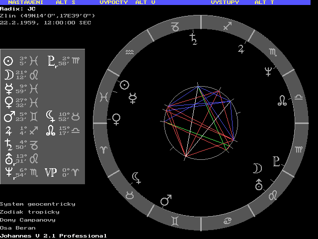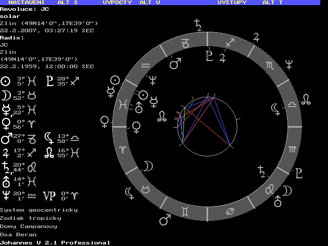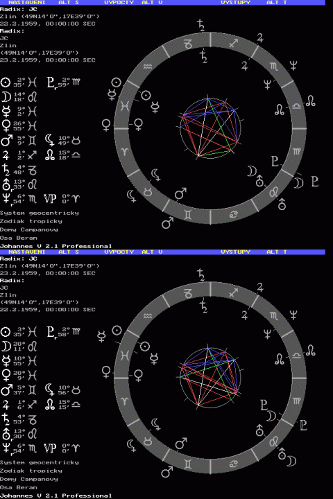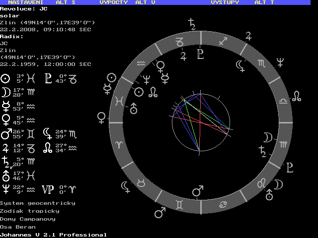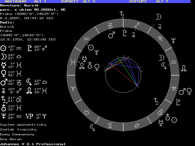 Jarmilo, pokud to říká on o sobě, tak bych byl obezřetný. On moc mluví, někdy si myslím, že ani neví co říká, že něco plácne, něco co je "ve vzduchu" a pak se diví. Takový lehký hebefrenik. Proto si myslím, že má Lunu v opozici na Merkura, resp v kvadratuře na Marse. S lidmi, které tahala StB na výslechy jsme se shodli, že lže, ale dost naivně, asi tak jako u prvního až třetího výslechu, ještě v tom neumí chodit. PT