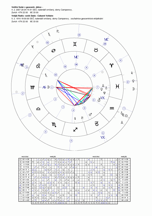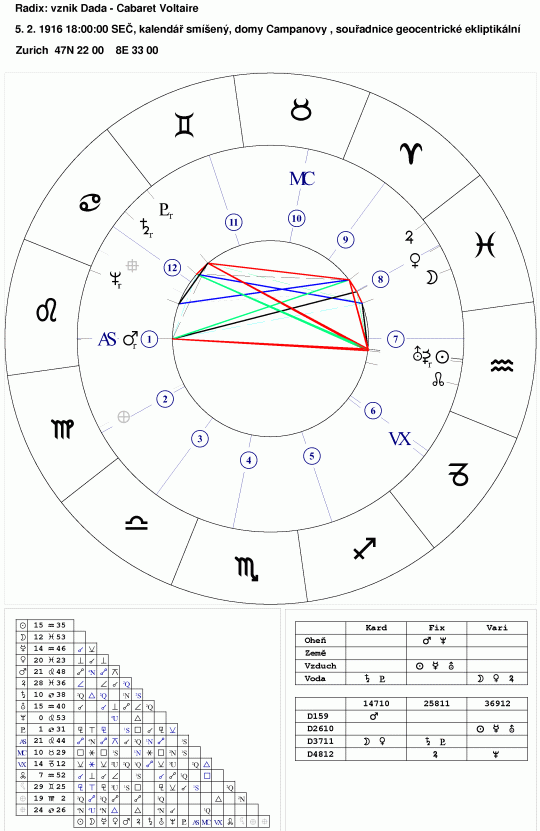 dada nikdy nezaniklo, ale přesto jakési jeho oživení by mohl pražský festival znamenat. V aktuálním soláru najdete kromě zcela evidentních jevů na horizontu (as-ds Luna-Uran,Venuše) a kontaktu dadaslunce s opozicíc Neptun-Saturn, i pozoruhodný tranzit Urana přes Lunu a přechod Saturna přes ascendent radixu: nové kontury, rysy hnutí nebo lépe řečeno dada-postoje. K dada mám osobní vztah, určilo moje světonázorové směřování, když v lednovém čísle ročníku 1965 revue Světové literatury vyšel první díl materiálů Dada-panoráma.