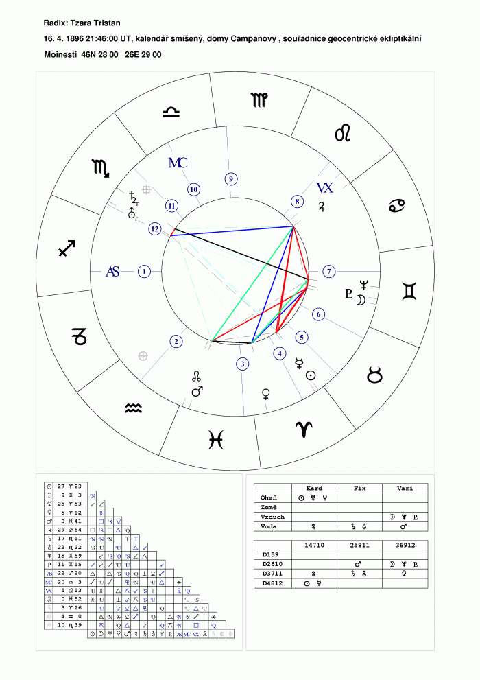 Symetrický obrazec v nativitě jednoho ze zakladatelů dadismu rumunského básníka Tristana Tzary. obrazoborecká konjunkce Saturna s uranem v 11. domě kolektivního hnutí.