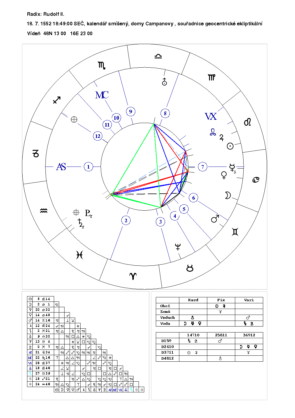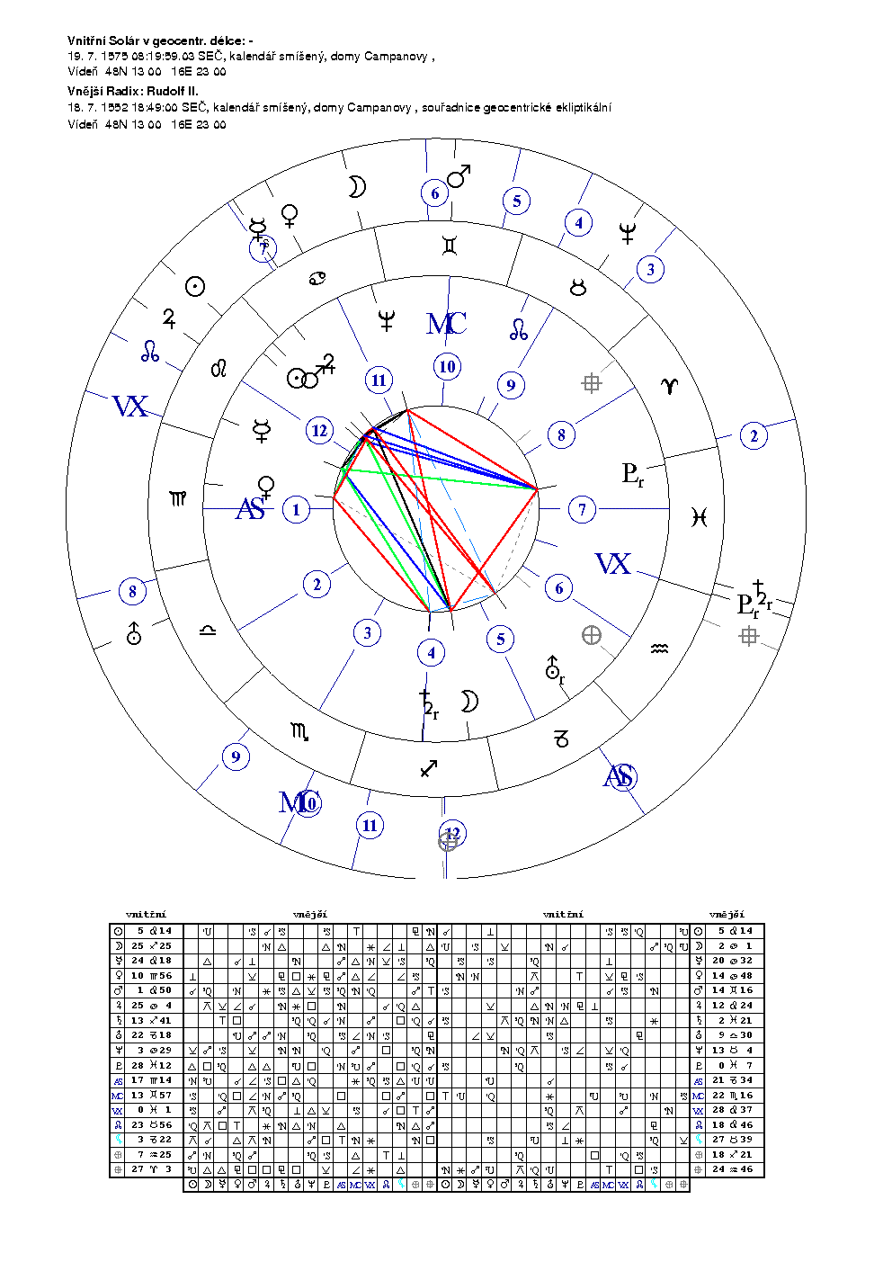 "Ukážeme si to na vedlejší otázce vztahující se k Rudolfu II. na soláru, předcházejícím jeho zvolení českým a římským králem a korunovac na císaře římského, což byl zásadní krok v jeho osobním vývoji, doprovázený tranzitem Urana přes scendnet nativity"