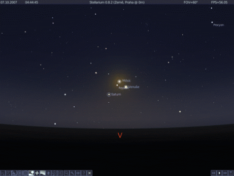 Dnes nad ránem jsem si všimnul, jak se ubývající Měsíc blíží k Venuši. Podíval jsem se tedy do Stellária, jak bude konjunkce vypadat. Pokud budeme mít v době kolem 5. hod. ranní jasný východní obzor, bude to stát za trochu úsilí a event. pobíhání se stativem a foťákem. Ve hře je toho totiž víc - budou tam pohromadě Měsíc, Venuše, Regulus a Saturn, všechno dostatečně jasné objekty. Měsíc ve tvaru úzkého srpku už by neměl expozici moc ovlivňovat, ale bude to chtít ne automatickou, ale ručně nastavenou expoziční dobu a více snímků.