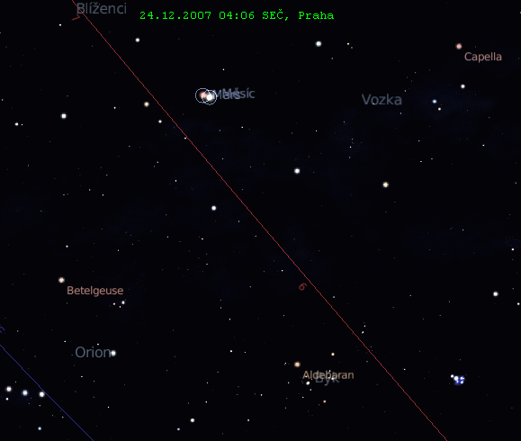 Ale jak se tak dívám na vánoční konjunkci, tak bych řekl, že je fakt hustá! Z kolečka to samozřejmě vidět není, ale Mars v opozici bude jako vždy neobyčejně jasný (protože je za daných geometrických podmínek Zemi nejblíže). Aby toho nebylo k vánocům málo, profrčí 23. Měsíc těsně nad Plejádami. Pokud jsem si všimnul dobře, bud v šířce Měsíce a Alcyone rozdíl něco kolem jednoho stupně - zákryt Plejád z toho tedy nebude. Ale ta podívaná bude stát zato!!!