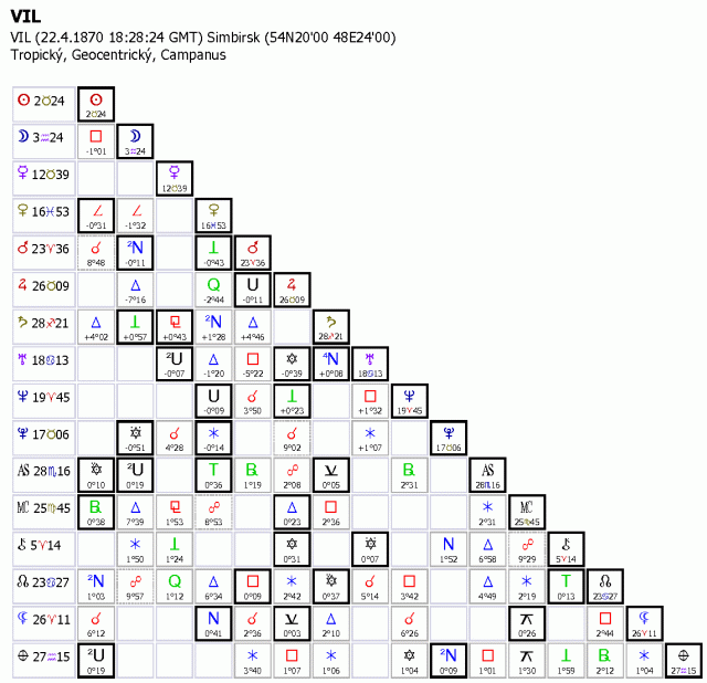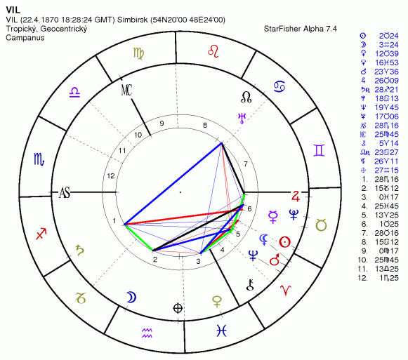 b/R.Service uvádí datum narození Lenina lO.4.1870 /nikoliv 22./. Je někde chyba? Po přečtení knihy bych dala přednost desátému dubnu a Luně ve Lvu /jsou tam pak přesnosti z hlediska direkcí/, ale nejsem si stoprocentně jista. Požádala bych o radu, protože mě tato záležitost nesmírně zaujala a chtěla bych se pokusit o konfrontaci dvou ďáblů, z nichž jeden je větší. Který, na to musíte přijít sami.Pokusím se sem dát horoskop, když to nepůjde, musíte sami /hodinu a Simbirsk jsem nechala, jak je uvedeno v databázi/.Marcela
