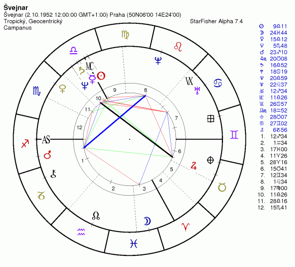 Bez astrologického pohledu předesílám, že Švejnar nemá jakožto emigrant šanci. Známe negativní postoj Čechů k emigrantům, který se jistě promítá i do senátu a parlamentu. S Klausem jsou vpodstatě všichni spokojeni, dokonce i s komunisty mluví, tak proč by ho měnili? Pár renegátů v ODS se jistě najde, kteří mu to nehodí, ale podobně i v ČSSD se najdou tací, kteří to zas nehodí Švejnarovi. Ještě by nám tady zaváděl nějaké nové pořádky a strkal možná nos kam nemá.