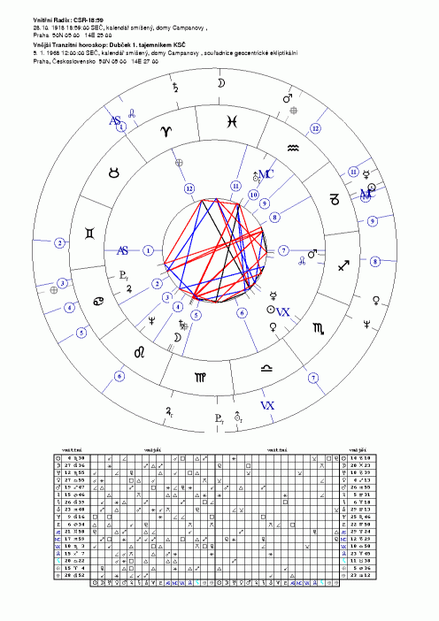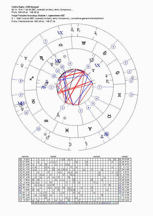 protože máme výročí pozoruhodného roku našich ději, můžeme se pokusit srovnat některé možné horoskopy ČSR tedy zejména ten z půl dvanácté a ten ze sedmé večerní. Jako první se nabízí volba Alexandra Dubčeka prvním tajemníkem UV KSČ a tedy prvním mužem ve státě