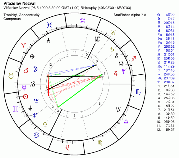 V básni Veliký orloj, která je celá astrologická (viz moje stať Nezval, astrologie a surrealisté) uvádí ještě nekorigovaný čas narození okolo 4. hodiny ráno.