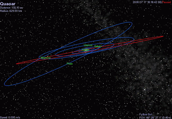 Zajímavý pohled v rovině oběžné dráhy Sedny na dráhu Quaoaru. Jak vidno, úhel s ekliptikou není tak divoký, jako v případě Pluta.