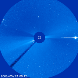 Jen maličkost: Pokud se podíváte na libovolný astrologický program a v něm na aktuální postavení planet, uvidíte hned, že se schyluje ke konjunkci Venuše se Sluncem. Zatím je ještě Venuše dost stranou. Tím vzniká otázka, co je vlastně v zorném poli SOHO koronografu vidět. Tento modrý záběr by měl zahrnovat zorný úhel, který pokrývá asi poloviční rádius než jaký má oběžná dráha Merkuru.
