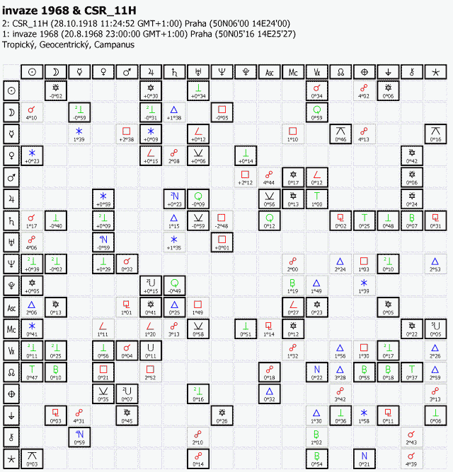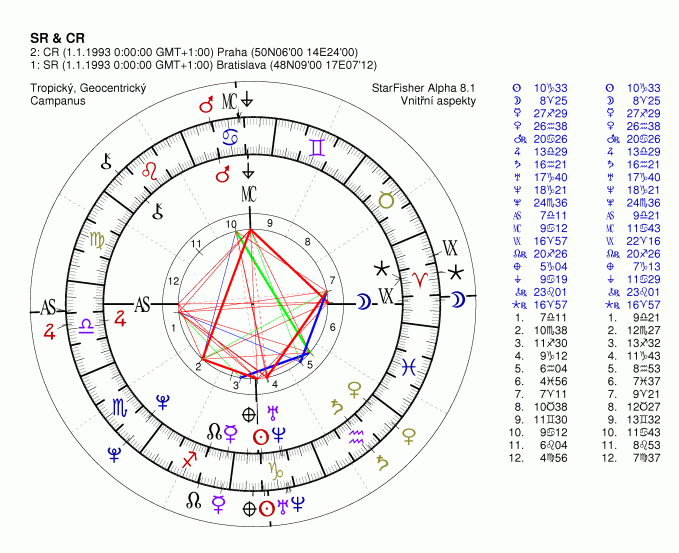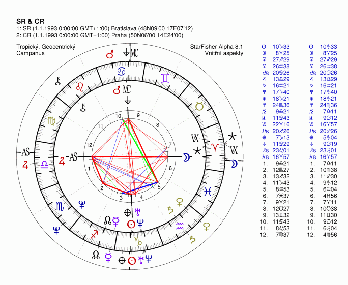 Tranzity vůči osám obou radixů a bodům štětstí duch v obou radixech se samozřejmě různí, neboť ony radixy díky vzdálenosti mezi Prahou a Bratislavou nejsou identické: