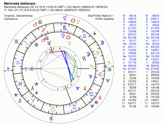 "Mars martinské deklarace se od 14 hod do půlnoci pohybuje na 21 Střelec 07-25, jelikož jdo o čin (Mars), kterým se přihlačují Slováci ke spolupráci/spolužití s Čechy, mohl by být descenden CR někde v první polovině 22° Střelce (21°07´-25´) +- orbis 1°"