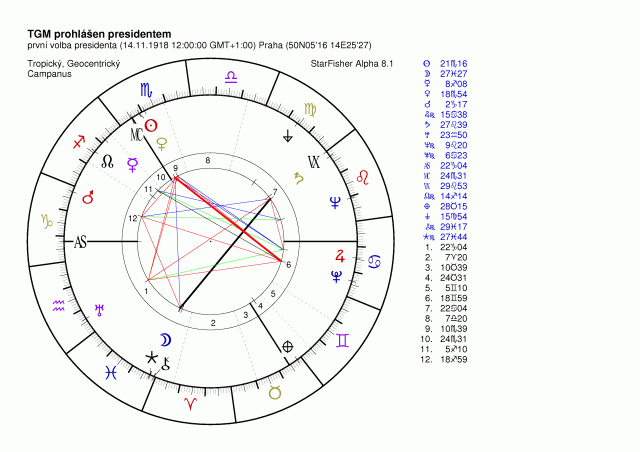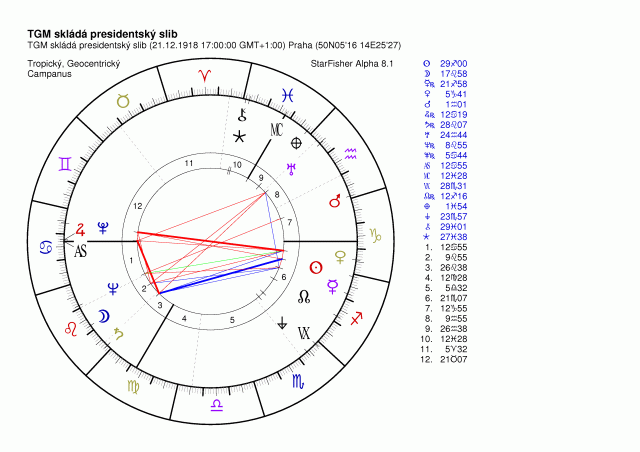 jenže aby ty osy byly totožné a splývaly tak tranzity vůči AS/DS musel by dopolední radix nést čas cca 11:07 a pak jsou tu výrazně rozdílná MC a tranzity na ně. Schůze předsednictva Národního výboru začiná okolo 11:30 (rektifikace Šimandl, Vrla, A.M.Svoboda) mají asc 26-27 Střelce, Rudhyarovský radix cca 19 hod má asc 22 Blíženců schůze celého Národního výboru v Obecním domě a schválení prvního zákona republiky, čímž teprve uskutečněna ta pravá velezráda. Do té doby šlo vše vysvětlit jako jednání v intencích Manifestu císaře Karla.
