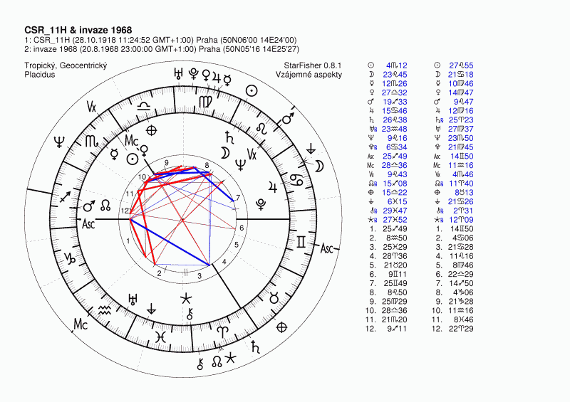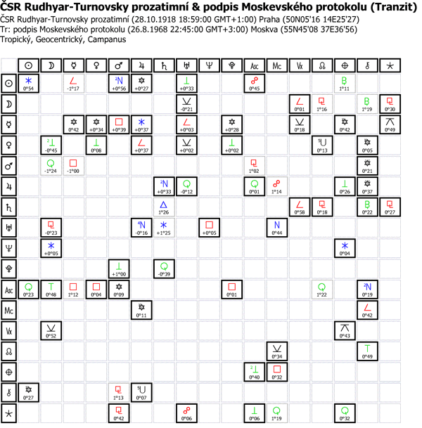 26.8.1968 okolo 22:45 Moskevského času podepsala čsl. "delegace" kromě Fr. Kriegla tzv. Moskevské prtokoly, které znamenaly kapitulaci čsl. vedení. Jako zásadní tranzity tu vidíme na 1´ přesnou kvadraturu Plutona vůči ASC ČSR 18:59 SEČ a Neptunovu kvadraturu vůči Uranovi v 10. domě