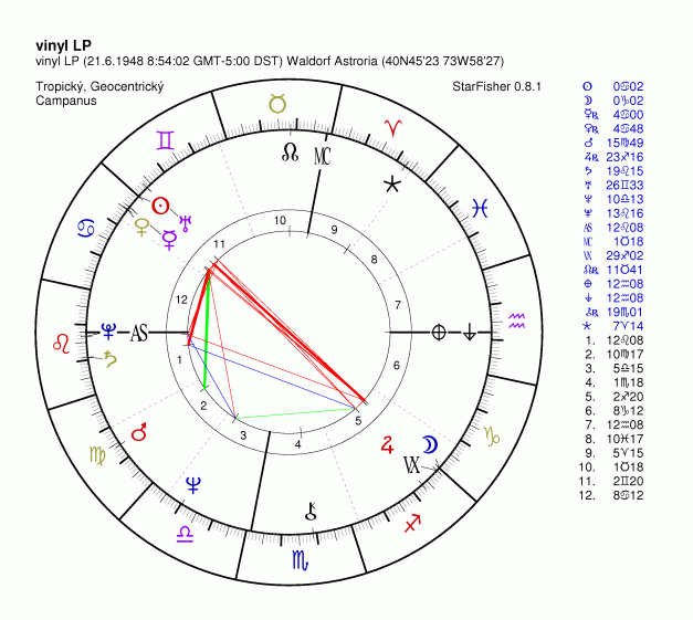 z astrologického hlediska pozoruhodné okolnosti, za nichž záměrně Columbia Records představili LP v roce 1948 v hotelu Waldorf Astroria v N.Y.C. Byloto v nejdelší den roku o letním Slunovratu a navíc byl úplněk s Jupiterem v konj.