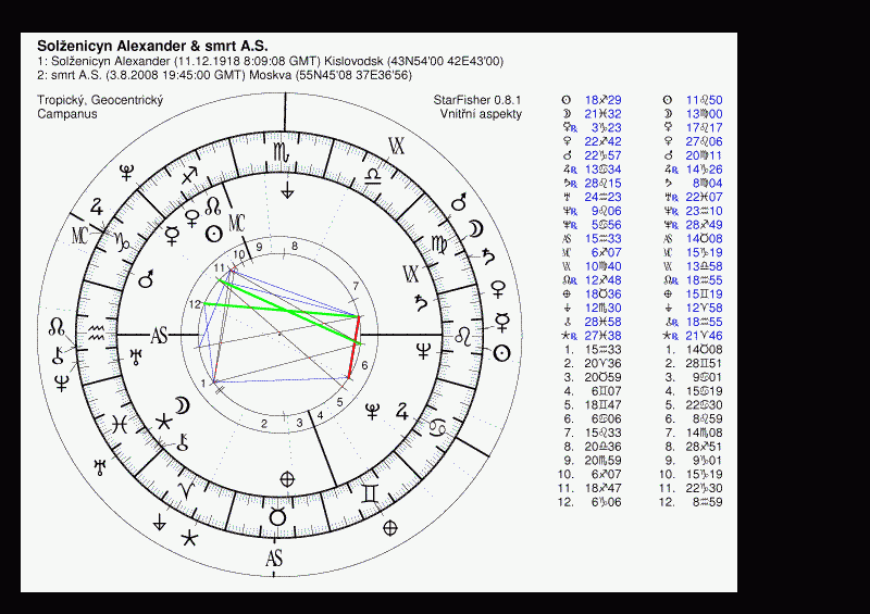 Alexander Solženicyn se narodil 11. 12. 1918 v Kislovodsku v 11 nebo 11:30 LT (podle paní Lois Rodden, zdroj neuveden) a zemřel včera 3.8.2008 v 23:45 "Moskevského" letního času na svém sídle poblíž Moskvy na selhání srdce