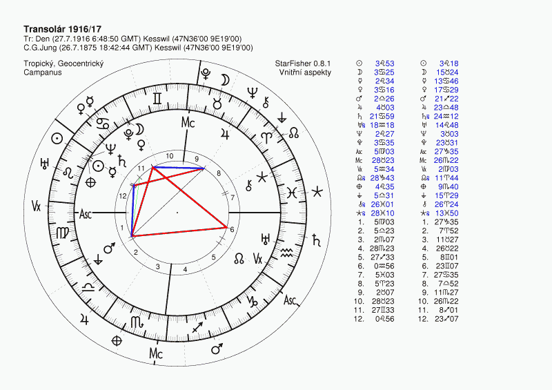 V trasoláru dorazila Luna do přesné konjunkce s Plutem a Venuší v 11. domě, kde přesně ilustruje nasloucháním hlasů z hlubin, zatímco Slunce na hrotu 12. domu ukazuje na zdroj ispirace a identifikace se vzorem uloženým v kolektivním nevědomí. Jung podepsal svůj inspirovaný a inspirující text Basileidés a místo inspirace Alexandrie, místo, kde se Východ dotýká Západu.