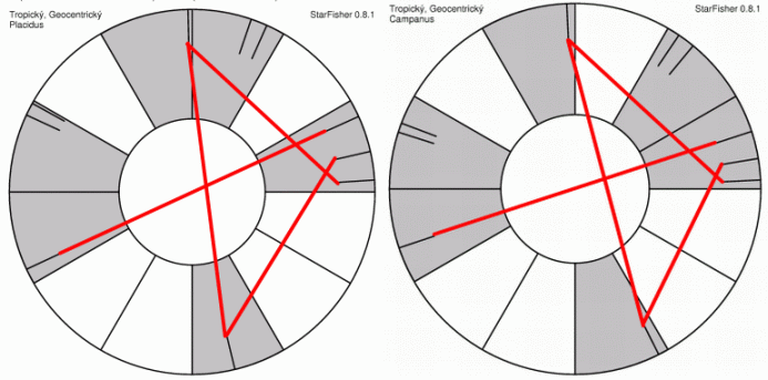 Vidíte, že tvar horoskopu vykazuje i v Placidovi 4. dílnou formu, která vystupuje ještě výrazněji v Campanovi. Matc Edmund Jones tuto kvadratickou matrici nezná, narozdíl od Meiera-Parma a Rudhyara. Čtyřdílný tvar navíc podporují i opozice a kvadratura