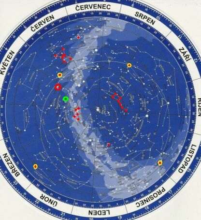 Zkusila jsem vzít Jiřího zobrazení denderského zodiaku, a pokusila jsem se tam velmi zhruba a neuměle zakreslit ekliptiku. Zároveň jsem naskenovala otočnou mapu hvězdné oblohy zakoupenou v Planetáriu - s vědomím, že se dopouštím chyby či odchylky, protože je to pro 50. stupeň sš. V ní jsem žlutě vyznačila Aldebaran, Regulus, Antares a Fomalhaut. Červeně některé význačné hvězdy - Sírius, Vegu, hvězdokupu Plejády; a taktéž červeně tři význačná souhvězdí pro orientaci - Orion, Cassiopeu a Velký vůz. Zeleně jsem tam přidala Algol.