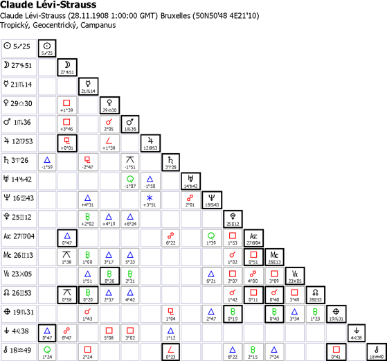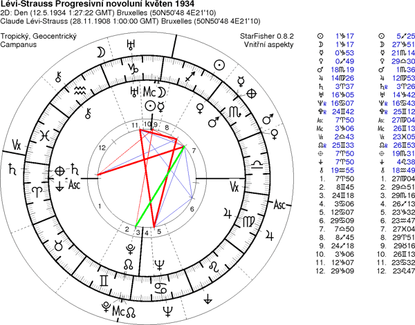 Na podzim roku 1934 dostal Lévi-Strauss nečekanou nabídku ucházet se o profesuru sociologie na univesitě v Sao Paolo. Tím byla nastartován ajeho dráha etnologa a později zakladatele strukturální antropologie. V nativitě uvolněná opozice Urana s Neptunem dosahla v té době v sekundárních direkcích naprosté přesnosti, pár měsíců předtím, v květnu došlo v progresích k novoluní na 2° Kozoroha