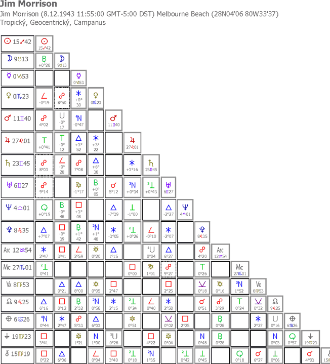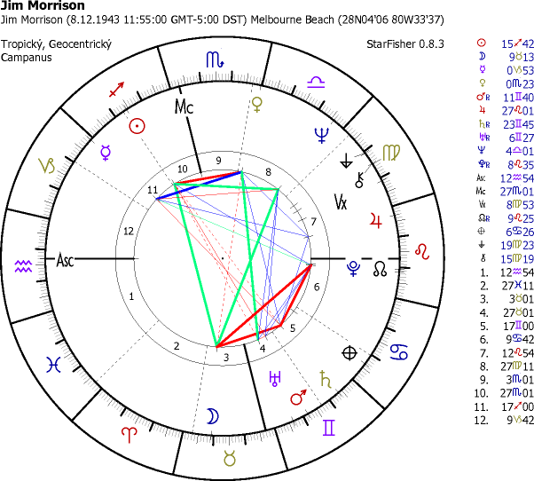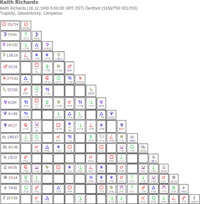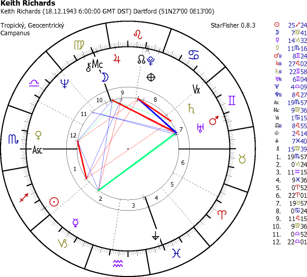 Hezké téma… V Jimove horoskopu nacházíme kvadrát Jupitera ze Lva na MC do Stíra (Slunce ve Strelci v 10. dome) a kvadrát Pluta do Lva na Lunu do Býka. Prílisná touha po odezve komplikuje zivotní cestu, hluboce zakorenená touha a potreba hledat jistotu v sobe sama a stát nohama pevne na zemi je v rozporu s nekontrovatelnou touhou po moci a vyjádrení své jedinecnosti, clovek se stává neodolatelným magnetem pro ostatní, vyzaruje obrovské charisma, sex-appeal, coz jde ovsem na úkor turbulentního emocionálního zivota a v jeho prípade nakonec i sebe sama. Keithovo Slunko je poháneno ohnivým trinem Jupitera ve Lvu v recepci smerem k excesum vseho typu, “zití na plné pecky”, potreba objevovat, vyhledávat dobrodruzství za kazdou cenu, podobne Luna na MC kvadrát Mars – Uran: rebel, který vyhledává vzrusení, zmenu, neobvyklé zázitky, borení zazitého, vznetlivost, ekcentricnost, nepredvídatelnost, ovsem se schopností naladit na své publikum. “Drzí” ho Saturnova opozice na Slunce a AS Stír, který (narozdíl od Jimova Vodnáre, který pusobí jak z jiného sveta) má schopnost prezít vsechno.