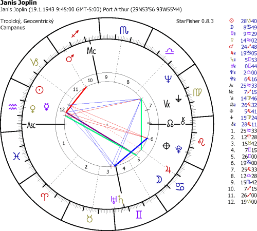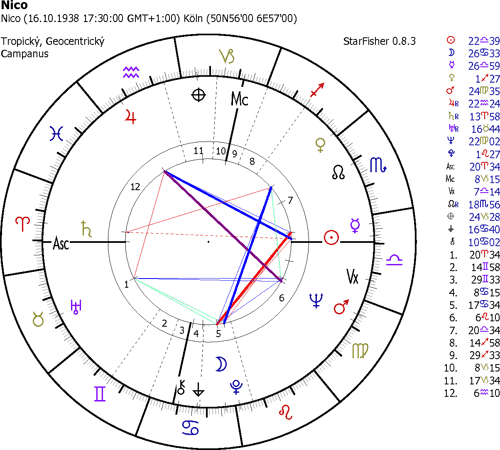 Já se jeste vrátím k té Nico, ten Jupiter v 11. dome ve Vodnári by ji mohl nabádat skrze trin na Slunce ve Vahách k tomu, aby se vznesla nad horizont bezné reality a upnula se k tomu co prijde, novému, hezcímu, lepsímu… Zároven pozice Marta, sice v 6. dome a v prízemní, konformní a pracovité Panne, ovsem v konjunkci s Neptunem jí mohla vést k tomu, ze pred jakýmkoliv problémem hledala tu nejsnadnejsí únikovou cestu. Saturn z 12. domu v Beranu opozicí na její Slunce (ve volnejsím orbisu) jí ovsem nenápadne pripomínal, ze zádný strom neroste az do nebe; kvadrát Pluta na Merkura, kterého má v konjunkci se Sluncem ve Vahách na DSC taky nasazuje cerné myslenky do hlavy. Na fotkách pusobí chladne, tvrde, neprístupne, uvnitr ale asi taková vubec nebyla (Luna v Raku jako nejnizsí prvek horoskopu), pod netecným povrchem mohla drímat pekne zhavá sopka, pripravená kdykoliv vybuchnout (Luna v kon. s Plutem ve Lvu). Jinak s tím trinem Pluta ve Lvu v 5. dome na Venusi ve Strelci v 8. dome není divu, ze tak mocne pusobila na muze okolo sebe a taky není divu, ze na nás do dneska její umení tak hluboce zasahuje.