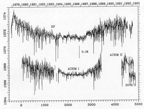 Podle satelitních měření, střední hodnota sluneční konstanty je S =1367 W/m 2.