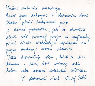 No a třeba zrovna já to mám obráceně. Rukou vždycky píšu myšlenky cizí (zápisy přednášek), takový škrabopis se hned tak nevidí, pokud chci zapsat všechno. Těsnopis neumím, nemám v sobě zodpovědnost a preciznost sekretářky. Po kapsách nosím mnoho tužek, per a propisek, protože vždycky naschvál psadlo vybouchne v nejnevhodnější chvíli. Na klávesnici dvěma prsty, ale o to rychleji, vybouchávám z hlavy myšlenky vlastní (někdy tedy jsou i vlastní). Výhodou největší je pro mne to, že pokud chci v textu překopat slovosled nebo odstavec, nemusím škrtat, a jde to velmi rychle.