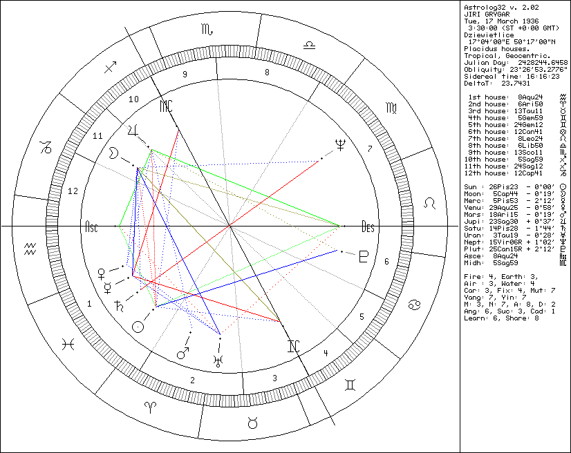 Není, Martino, on má společnost – v Rybách jsou 3 planety, v 1. domě dokonce 4 (Venuše je ještě ve Vodnáři). Myslím, že neporuším žádná etická pravidla, když sem nativitu páně Grygara vlepím, sám ji kdysi astrologům z ostravské společnosti předhodil v plen.