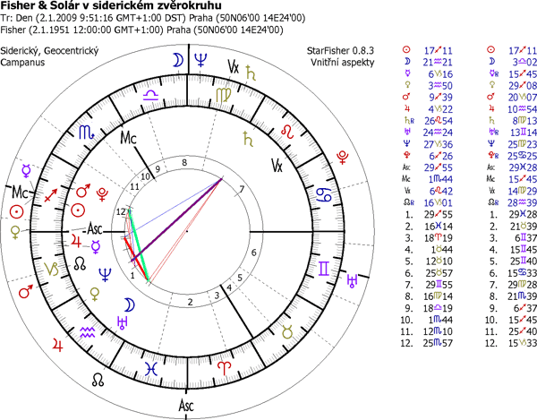 Přátelé, dovolím si připojit svůj názor: já bych se na hledání času narození pana Fischera úplně vykašlal! Proč? Protože ho nikdo z nás nezná! Je mu 58 let, a kdo z nás ví, jakými událostmi, které formují charakter člověka a jeho postoje ke světu, si za svůj život prošel? Usuzovat na čas narození z jedné jediné události, která pro něho osobně ani nemusí být nijak zvlášť důležitá, je pohyb na velice tenkém ledě! Můžeme to sice brát jako svého druhu cvičení, ale myslím si, že lidé formátu Pavla Turnovského nebo Vítězslava Čížka takové cvičení nepotřebují. Nemám pravdu? Píšu to proto, že já osobně jsem k jakýmkoliv takovýmhle pokusům a spekulacím velmi skeptický a nedůvěřivý, a myslím si, že mohou být mimořádně zavádějící! Uvedu jeden příklad ze své vlastní praxe: měl jsem kamarádku, báječnou ženskou, duchovně orientovanou, svého času v mém kursu studovala astrologii, takže jsem dobře znal radix jak její, tak i její rodiny (manžela a dvou synů). V určité etapě jejího života jí tranzitoval Jupiter přes radixové MC, z čehož by se dalo na první pohled usuzovat na výrazný úspěch v profesi a ve společenském postavení. Co se stalo? Dva dny před přesným tranzitem se zabila při autonehodě, dva dny po přesném tranzitu měla pohřeb… A velmi podobný případ ze své vlastní praxe mi kdysi vyprávěl i Milan Špůrek. Od té doby se nějakým konkrétnějším prognózám vyhýbám jako čert kříži, a pokusy o hledání neznámého času narození podle jedné jediné události u lidí, které dokonale neznám, považuji za ztrátu času.