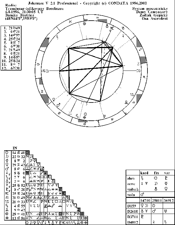 Trochu som sa unáhlil,zabudol som totiž,že v tom Lunáre som sa aj ženil(dávno aj rozvedený),kde Neptún vládne 5 a Luna pre 9 je typická pre manželstvo.Javilo sa mi to tak jasné s tým Neptúnom,ako o nákaze.Každopádne niečo na tom musí byť.....