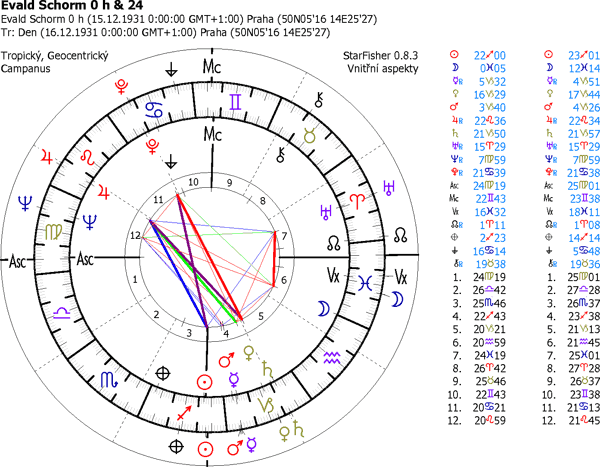 Když se dívám na jeho horoskop, vidím, že je tam „psychologický “ aspekt opozice Neptuna a Luny, stelium planet v kozorohu a především T-kvadratura Saturn-Pluto-Uran, která asi hlavně ovlivnila jeho tvorbu a postoje. Ta ale trvala jistě minimálně několik týdnů, ale Schorm byl jenom jeden. Protože mě to enormně zajímá, dokázal by mi někdo pomoct s rektifikací přesného času narození této osobnosti? Mimochodem Schormovské téma se asi právě teď vrací s opozicí Saturn-Uran, zvláště když Pluto vstupuje do Kozorohohaha... Nevím, jak sem vkládat obrázky, tak sem nemůžu dát jeho horoskop :-)